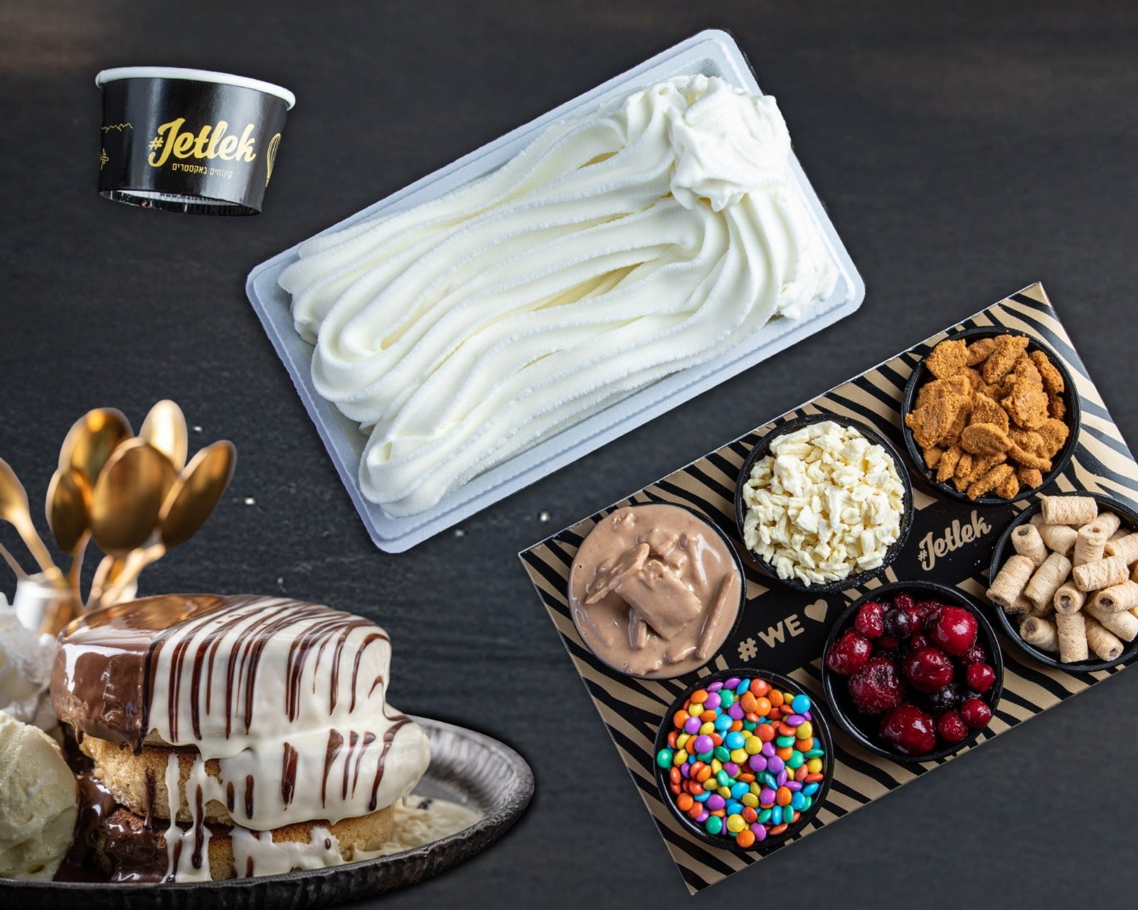 שתי יחידות פנקייק בציפוי שוקולד לבן + דיסק ברולה חרוך + חצי ליטר גלידה