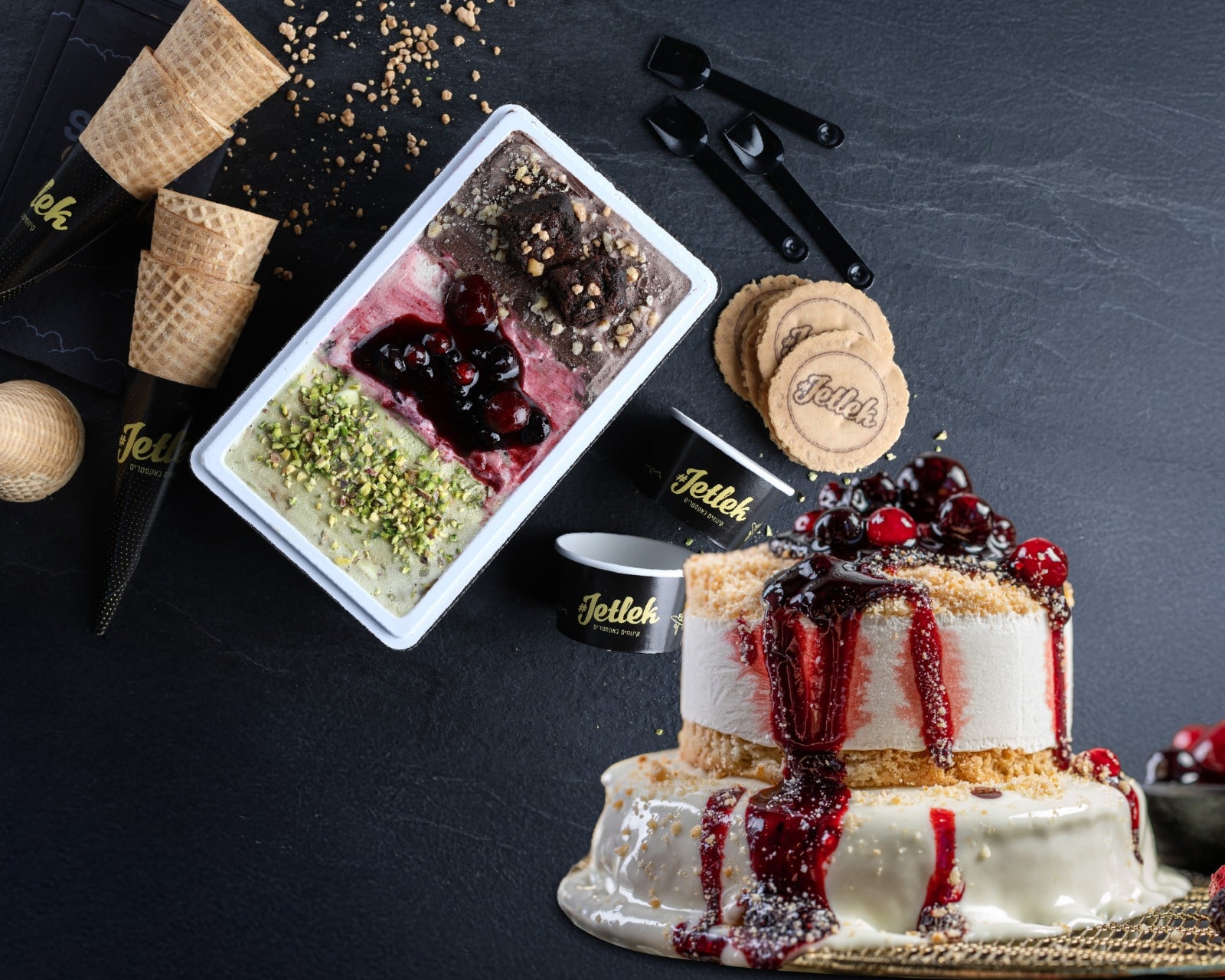 עוגת גבינה על פנקייק בלווי שוקולד לבן ופירות יער